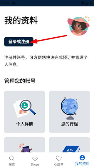 2、在个人资料页面,点击登录或注册,进入登录方式选择页面。
