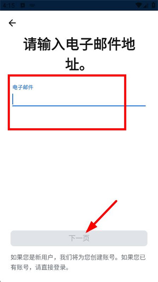 4、在电子邮件输入页面,输入电子邮件地址后点击下一页,完成注册操作。