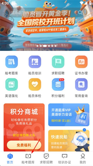 1、在船掌柜首页,点击船考题库选项,进入题库页面。