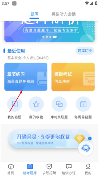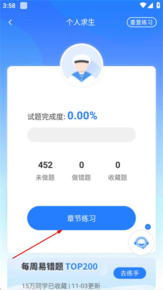2、在题库页面,点击章节练习选项,进入个人求生练习页面。
