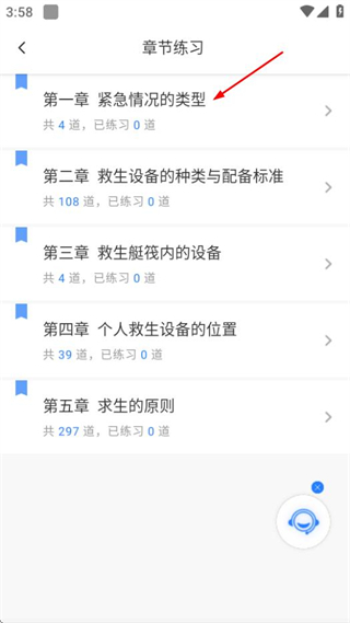 4、在章节选择页面,选择要练习的章节,如“第一章 紧急情况的类型”,进入题目练习页面。