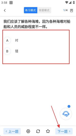 5、在题目练习页面,完成当前题目作答后点击下一题按钮,可继续练习下一道题目。