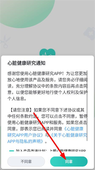 1、在心脏健康研究通知弹窗中,点击同意,进入登录选择页面。