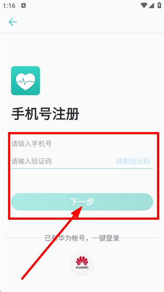 4、在手机号注册页面,输入手机号和验证码后点击下一步,完成注册操作。