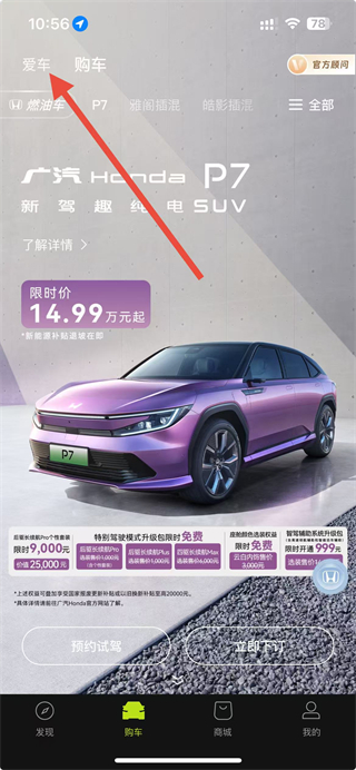 1、点击页面上方的爱车选项,进入爱车相关页面。