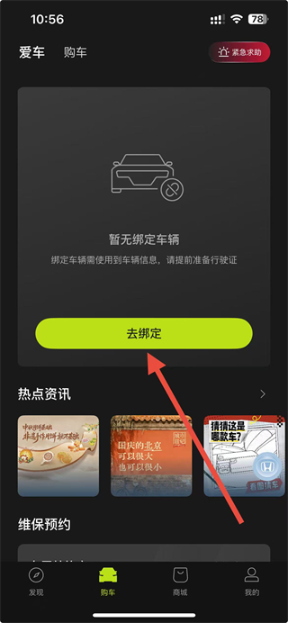 2、在爱车页面中,找到绑定车辆的入口,进入绑定爱车页面。