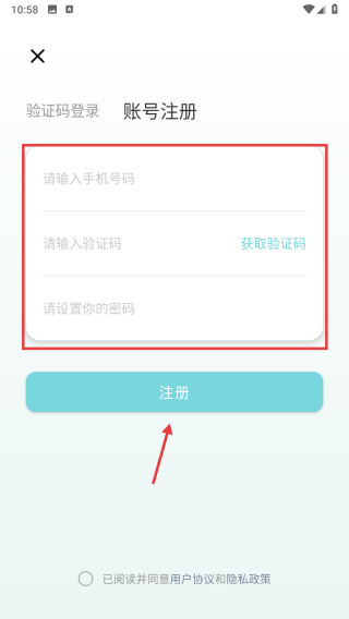 4、在账号注册页面,输入手机号、验证码并设置密码,勾选协议后点击注册按钮,完成账号注册操作。