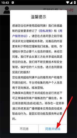 1、在温馨提示弹窗中,点击同意,进入超级阿姨主界面。
