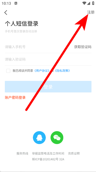 3、在个人短信登录页面,点击注册,进入注册页面。