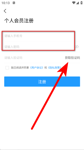 4、在个人会员注册页面,输入手机号,点击获取验证码。