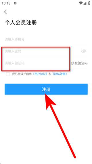 5、输入密码和收到的验证码,勾选同意后,点击注册按钮,完成注册。