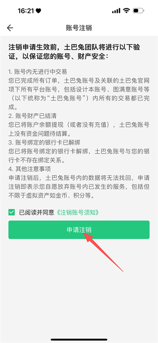 5、在账号注销说明页面,勾选已阅读并同意后,点击申请注销。