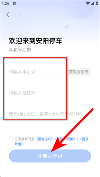 4、输入手机号、验证码、密码后,点击注册并登录。