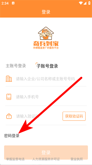 1、打开奇兵到家安装平台,进入登录页面,点击子账号登录。