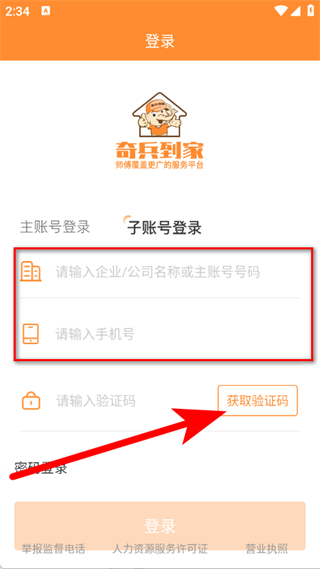 3、在登录页面,输入企业与主账号号码、手机号后,点击获取验证码。