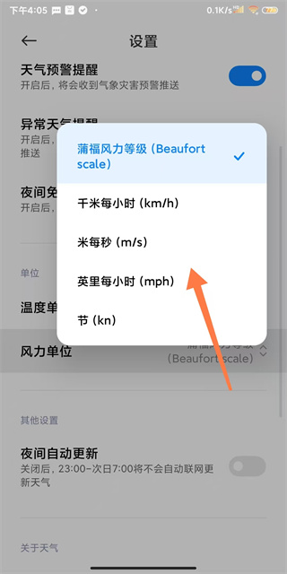 4、在弹出的风力单位列表中,选择所需单位,如千米每小时、米每秒等,即可完成设置。