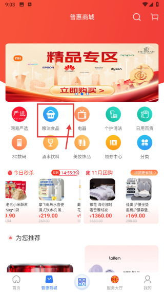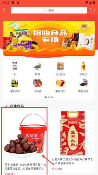 2、在普惠商城页面,点击粮油食品分类标签,进入粮油食品商品列表页。