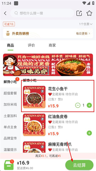 2、在外卖美食页面,选择要下单的店铺,进入店铺商品页面。