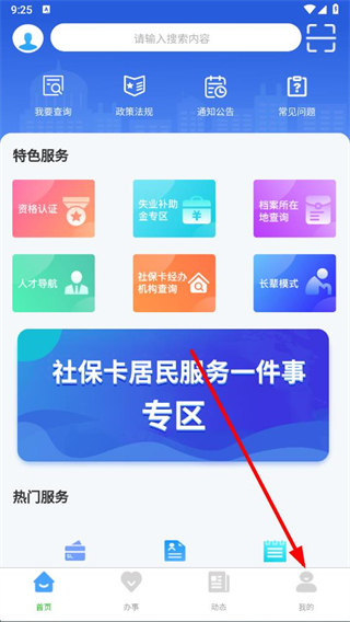 1、打开哈尔滨智慧人社APP,在首页点击右下角我的选项,进入个人相关界面。
