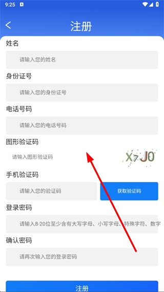 3、在注册页面,依次填写个人信息,输入验证码,设置并确认登录密码,完成注册。