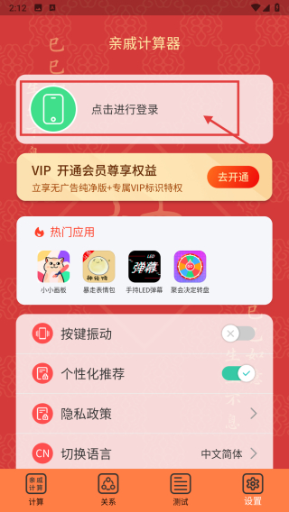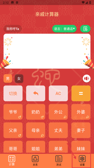 1、打开亲戚关系计算类APP,点击底部设置选项,进入设置页面。