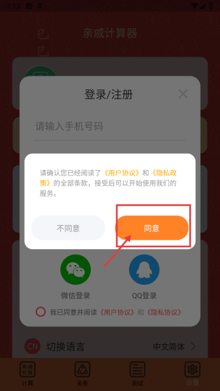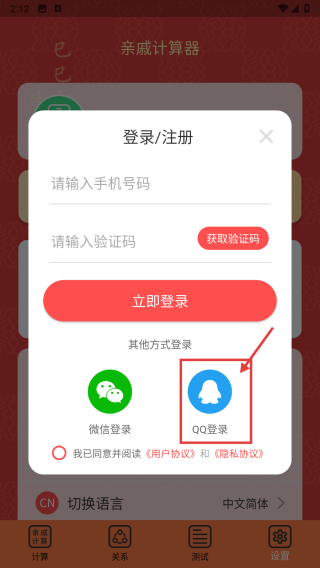 3、在登录/注册界面,点击QQ登录选项,弹出用户协议确认框。
