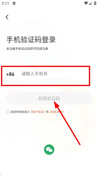 3、在手机验证码登录页面,输入手机号后点击获取验证码。