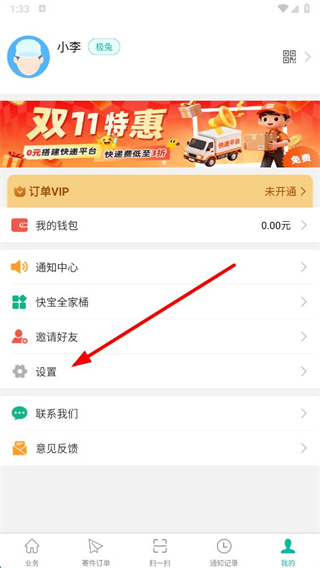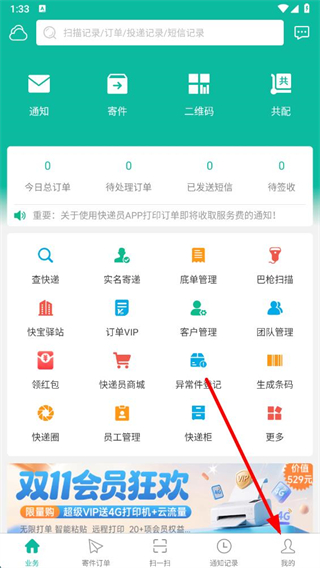 1、在快宝快递员业务页面,点击右下角我的进入个人页面。