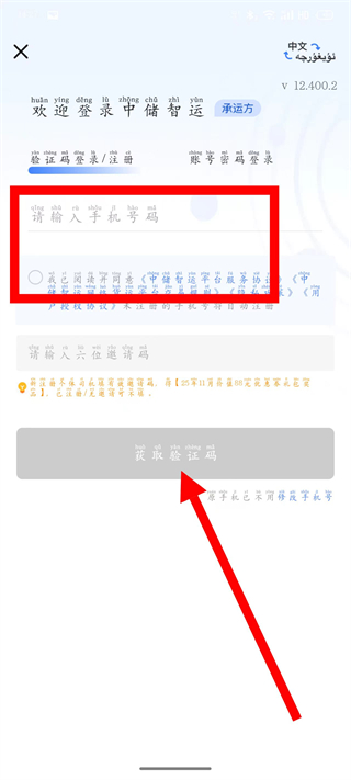 3、在登录页面,输入手机号后,获取并输入验证码。