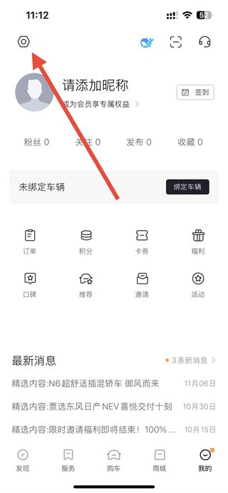 1、打开东风日产app,在我的页面点击左上角设置图标,进入设置页面。