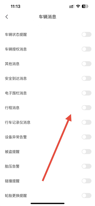 4、在车辆消息页面,找到车辆消息相关提醒功能,将对应的开关按钮打开,即可开启车辆提醒功能。