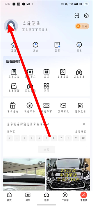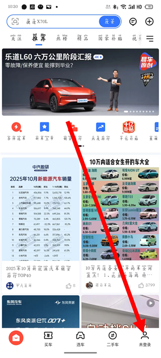 1、打开易车,点击底部未登录,进入个人中心页面。