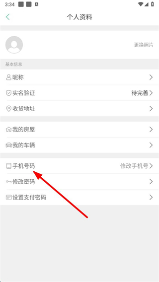 3、在个人资料页面,找到手机号码选项并点击,进入修改绑定手机号页面。