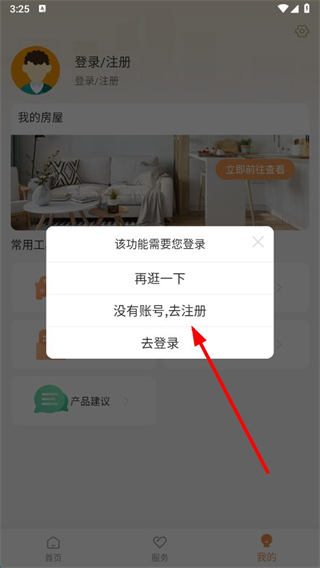 3、在弹出的提示框中,选择没有账号去注册选项。