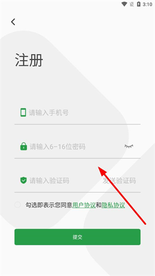 4、在注册页面,输入手机号、密码及验证码,勾选同意协议后点击提交完成账号注册。