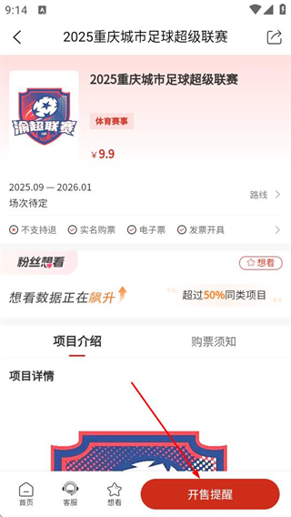 4、在赛事详情界面点击开售提醒,可设置开售提醒。