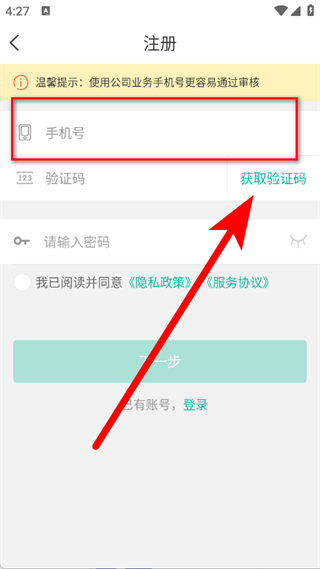 3、在注册登录页面,输入手机号后,点击获取验证码。