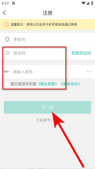 4、输入验证码并设置密码,勾选后,点击下一步,完成注册。