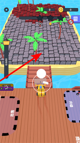 1、在游戏界面,操控挖掘机前往岛屿区域,挖掘地面获取资源。