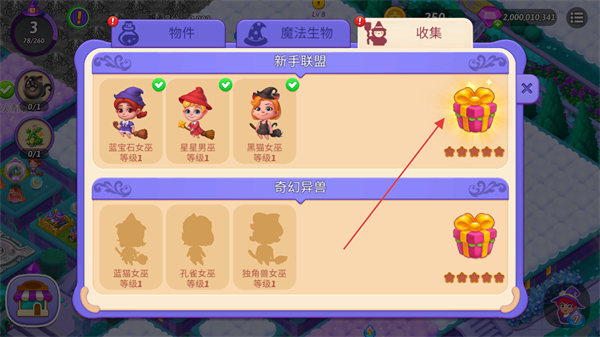 3、完成收集任务中的新手联盟收集,领取礼盒奖励,提升游戏进度。