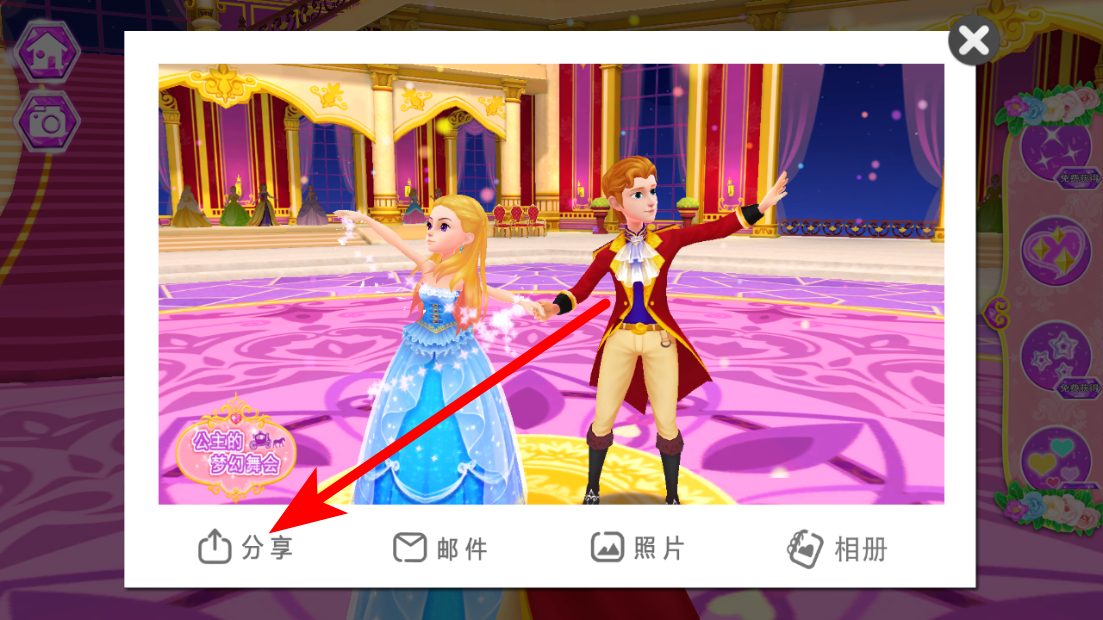 1、在公主的梦幻舞会界面,点击右侧特效选项,添加舞会特效。