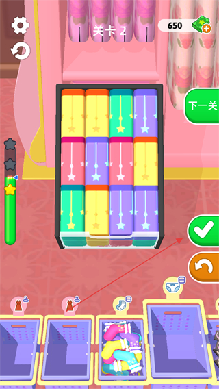 4、继续整理剩余衣物如内衣,全部整理完毕后,点击下一关进入新关卡。