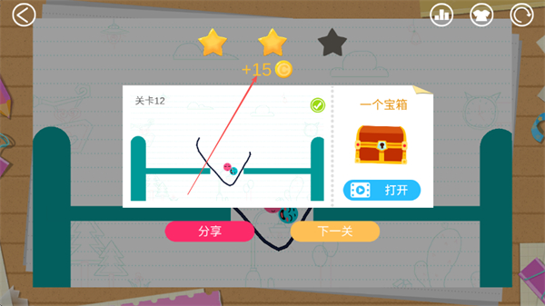 4、通关后获得星星评价和金币奖励如+15,点击下一关继续挑战,还可打开宝箱获取奖励。