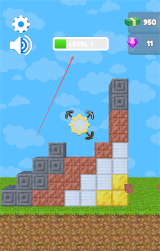 3、持续发射钻头,清理方块区域,当Level1的进度条填满绿色时,即可完成关卡。