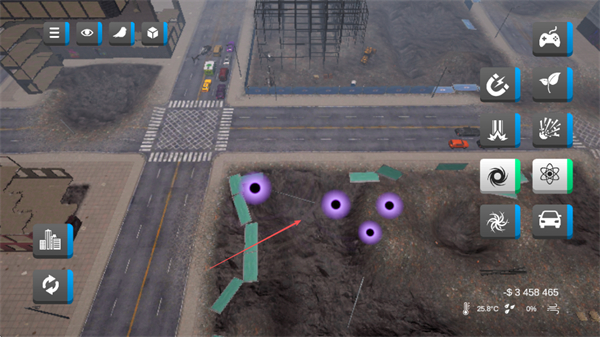 1、选择右侧的黑洞、核爆等灾害工具,在城市区域释放,制造破坏效果。