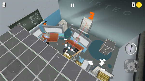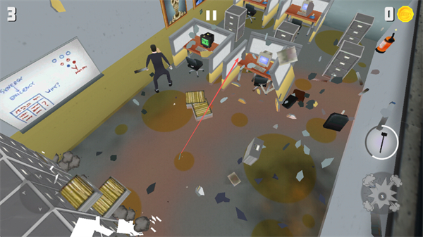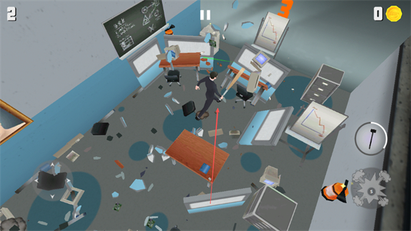 1、操控角色在办公室内移动,破坏办公桌椅、电脑等物品,制造混乱。