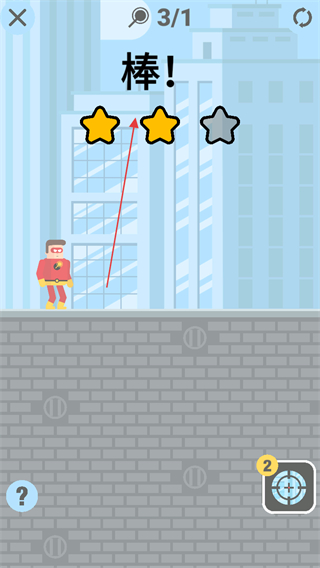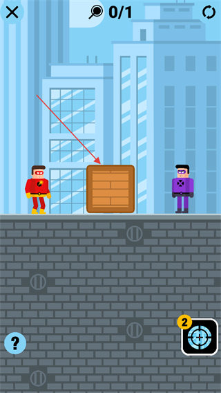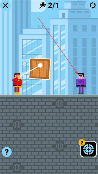 2、画出直线连接超级英雄与木箱,再连接木箱与紫色人物,完成2/1的消除进程。