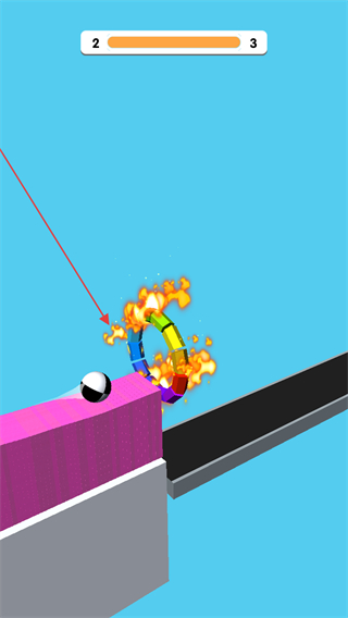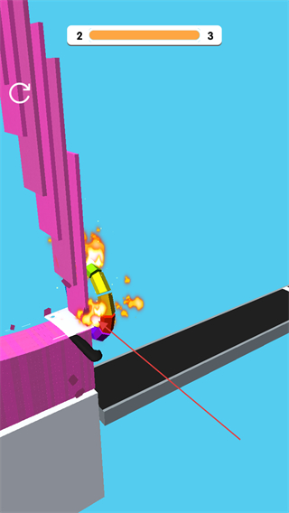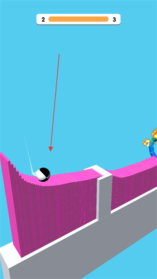 1、操控切片工具切割粉色障碍物,通过切割减少其高度,推进关卡进度上方进度条显示当前关卡从2向3推进。