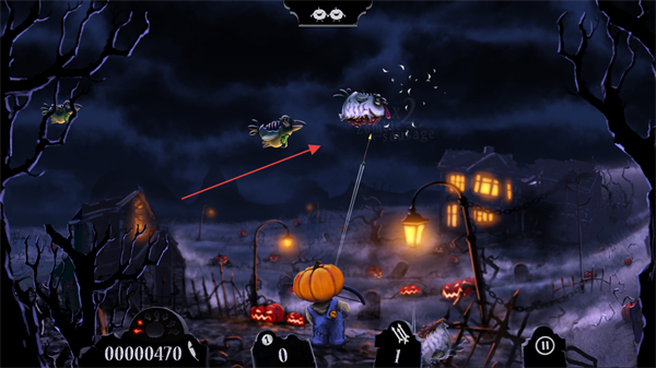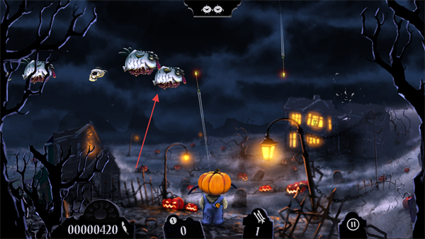 1、操控南瓜头角色,瞄准空中的僵尸鸟、骷髅等敌人发射武器。