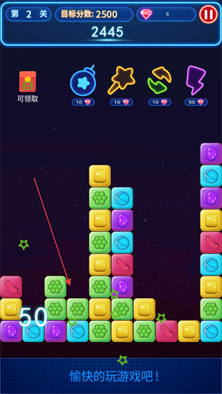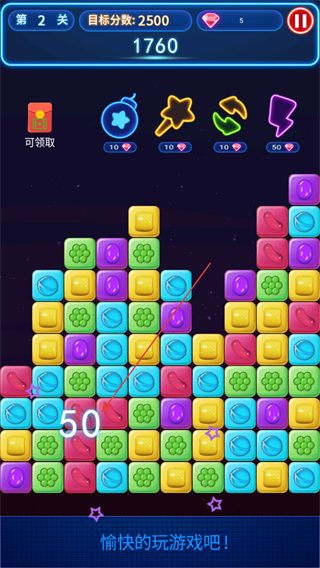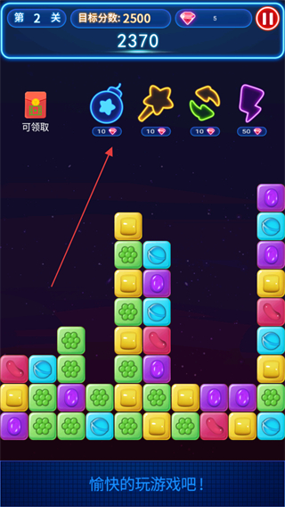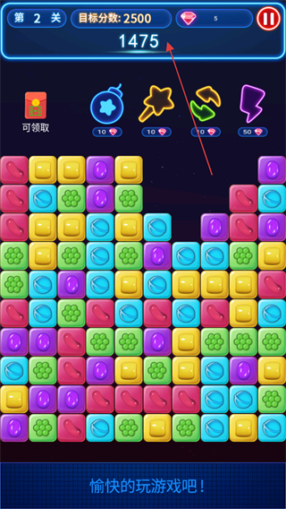 3、合理使用道具,如炸弹道具消耗10钻石,可帮助快速消除大量方块,提升得分效率。